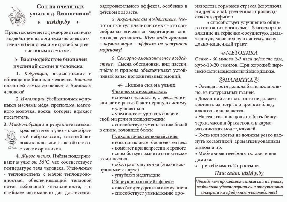 Сон на ульях помогает облегчить состояние пациентов с болезнями Альцгеймера, Паркинсона. Где-то на 6-7 день курса лечения процессы в организме начинают перестраиваться, проявляется лечебный эффект. Ввиду неблагоприятной экологической среды, стрессов и пр. биополе человека, особенно горожанина, разбалансировано. Ученые Запорожского института исследовали биополе человека до начала лечения и после него — при абсолютно разбалансированном биополе до начала лечения оно восстанавливалось по окончании лечения, в итоге, энергия так и «брызжет»!