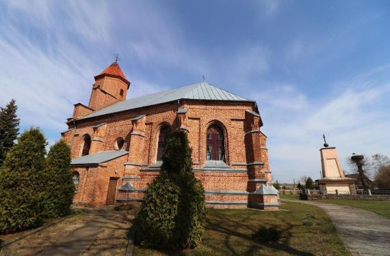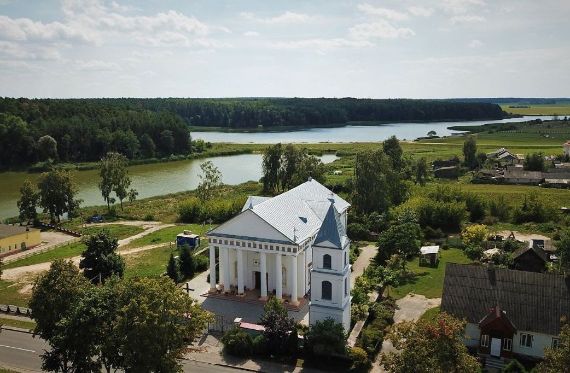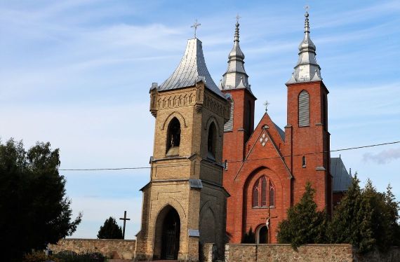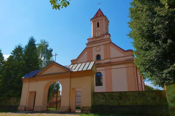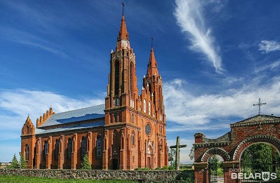 Построен в 1907-1914 гг. В XVI в. на его месте стоял деревянный костёл - с тем временем связывают появление в местечке писаной по дереву иконы Божьей Матери, попирающей дьявола (или «Непорочное зачатие») чудотворной силы; как и «Троица» («Престол Благодати») – редкие иконографические сюжеты сакральной живописи не только в Беларуси, но и в мире. Старинному деревянному Распятию предположительно несколько столетий, которое во времена атеизма местные жители прятали в сарае много лет. Лишь на время атеизма храм закрыли и использовали как склад (40 лет) - за это время исчезла и та самая икона, но спустя много лет была найдена историками и сегодня хранится в Национальном художественном музее (в храме копия). Высота - 65 м. Один из самых высоких костёлов Беларуси. С его башни открывается захватывающий вид на окрестности в радиусе 20 км.